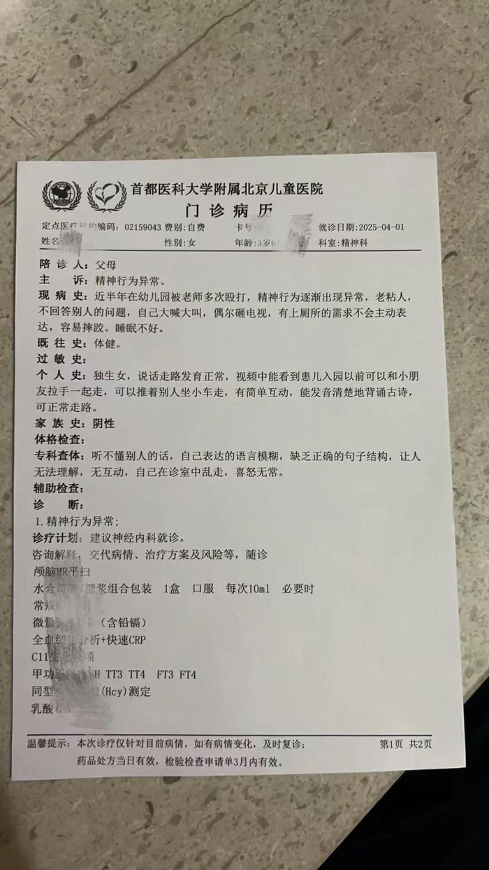 据孟先生提供的盘锦市中心医院急诊诊断证明书显示,他的女儿经头部CT初步诊断为“头皮挫伤”,建议到心理科就诊。今年4月初,孟先生带女儿去首都医科大学附属北京儿童医院精神科看诊,医生诊断为“精神行为异常”“建议神经内科就诊”。