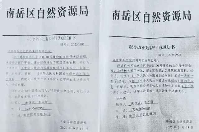 2025年9月12日,18日,南岳区自然资源局两次向南岳文旅集团下达责令停止违法行为通知书。但是,直到发稿时止,南岳文旅集团仍然置若罔闻,无动于衷,拒不整改。