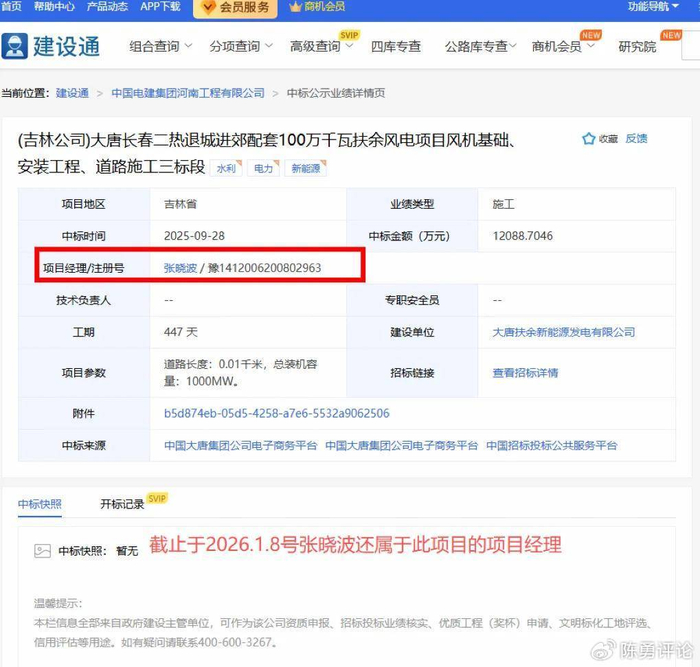 经《陈勇评论》核实,电建河南公司于2025年9月28日中标(吉林公司)大唐长春二热退城进郊配套100万千瓦扶余风电项目风机基础、安装工程、道路施工三标段”,项目负责人也是张晓波。