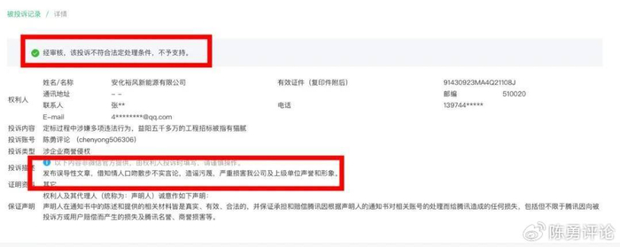 《陈勇评论》经过调查取证、核实证据之后发表的文章也被裕风公司投诉指责为:“散布不实言论”,充分暴露了裕风公司忌惮举报、欲盖弥彰、将违法行为进行到底,顽固抵抗公民和舆论监督的不可告人的目的。