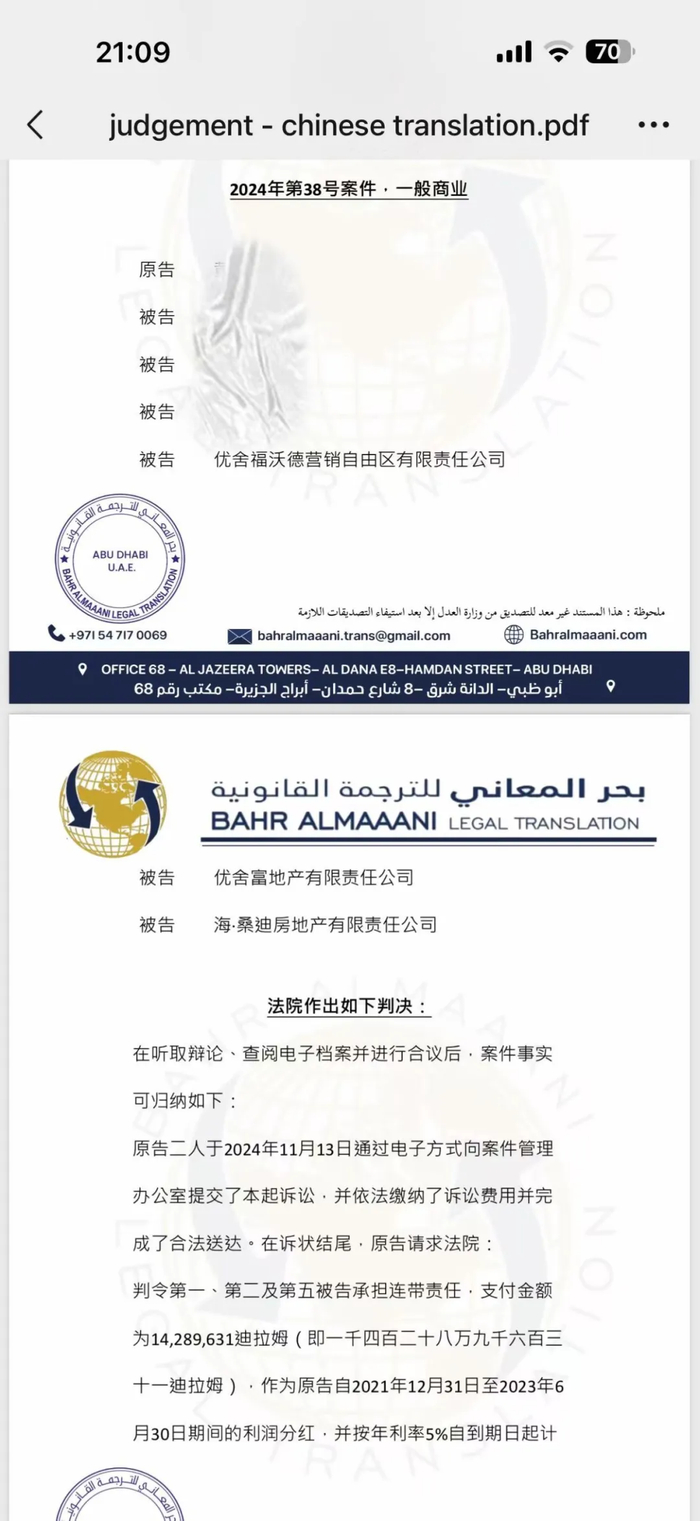 时隔两年整,黄某果向《陈勇评论》提供了一份迪拜法院的中阿双语判决书,称黄某和伏某两人作为原告,向法院起诉主张UCF Real Estate和Sun Rise Real Estate (Branch)两家公司的股份,黄某果和左女士都是被告。