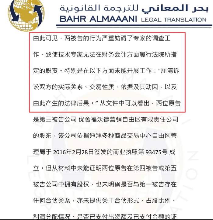 还有一个重要的推断和申明,在这个案件中,首先,我是第二被告,加之,迪拜法院只是驳回了黄某先生和伏某女士对于优舍国际房地产公司和嗨森迪房地产公司的股份所有权的请求,并没有否定我是这两家公司股东。