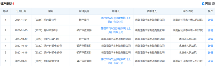 据天眼查显示,江南汽车涉及司法案件222起,案件身份为被告的占比91.44%,47.3%的案件案由为买卖合同纠纷。此外,该公司有5条破产重整记录,除了伟巴斯特车顶供暖系统(上海)有限公司,湖南江南汽车制造有限公司也对自己申请破产重整。