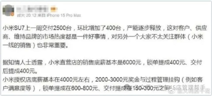 知情人士的消息称,小米直营店的汽车销售底薪约为6000元,锁单可提成400元,交付后还可提成400元。