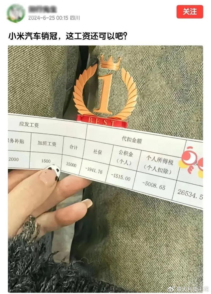 据一位小米汽车销售称,“不用去发传单,不用去做外展,不用担心客流。有雷总这个最大的营销头子,我们销售主打一个纯粹。对于小米SU7,我感觉店门口拴条哈士奇都能卖车!”