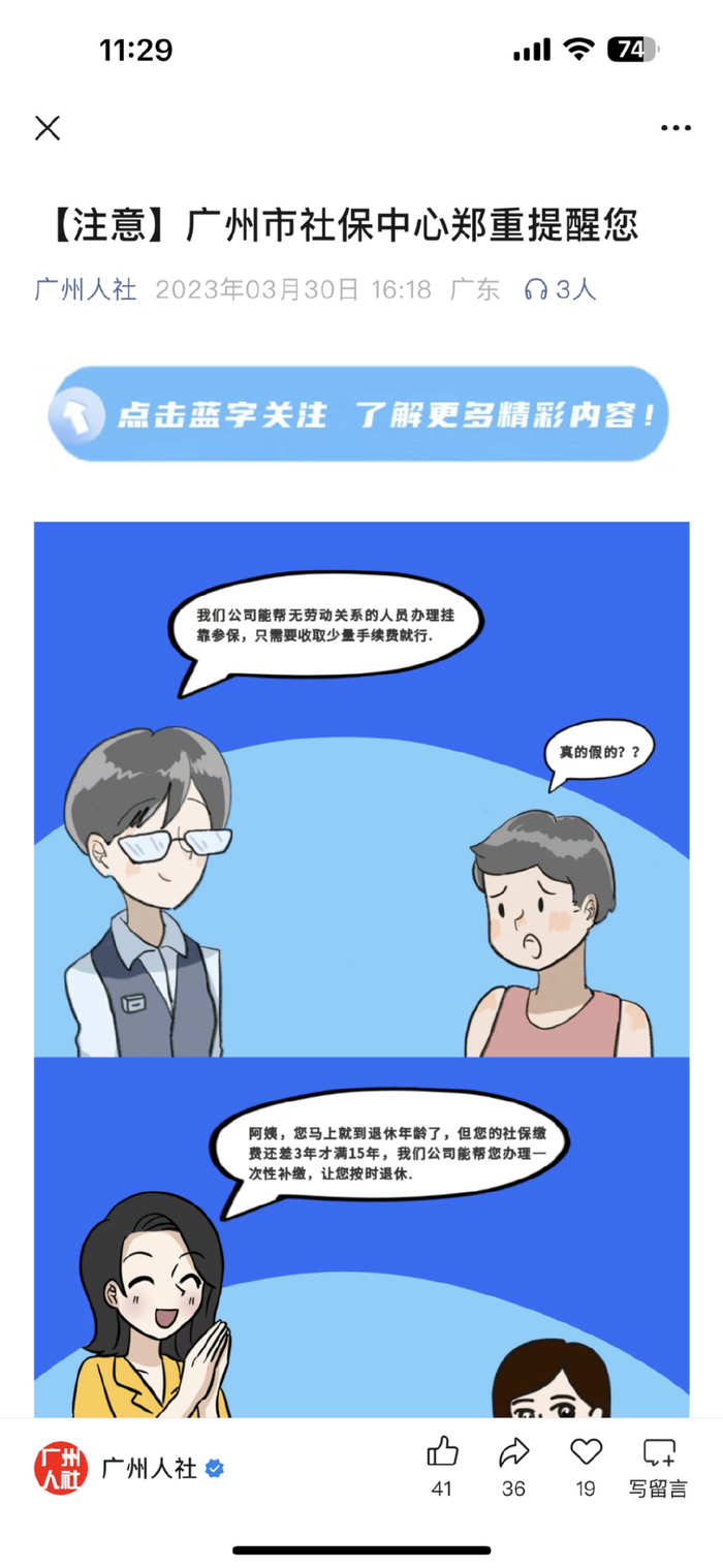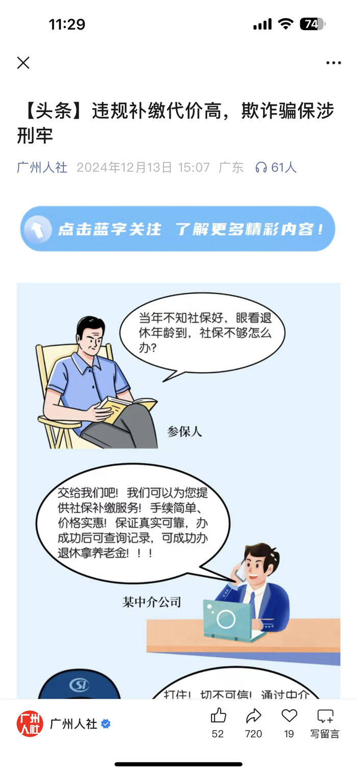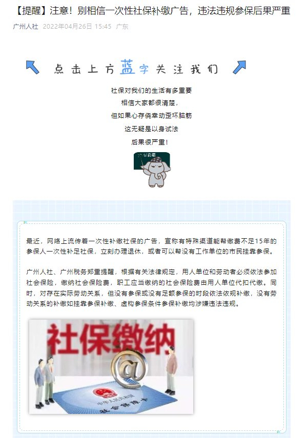 此前, 广州市人力资源和社会保障局等部门曾多次发布提醒称,“别相信一次性社保补缴广告,违法违规参保后果严重”。