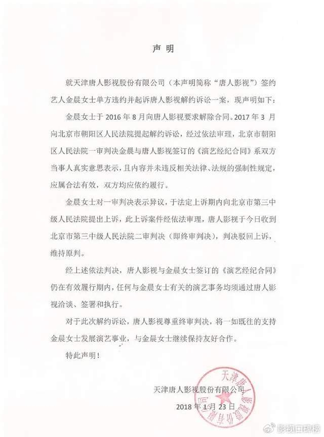 金晨在2016年8月要求与唐人解除合同,说白了就是辞职,于2017年3月提起诉讼,一审判决金晨必须继续履行合约。都已经撕破脸了,不可能就这样相安无事下去,金晨再接再厉继续向北京市第三中级人民法院上诉,法院在1月23日予以终审判决、驳回金晨的上诉,维持原判。