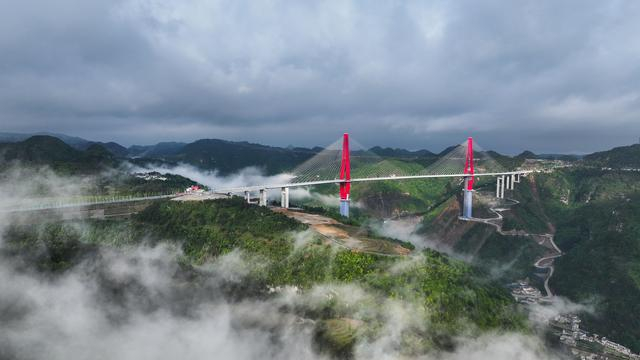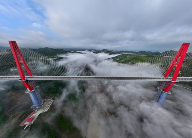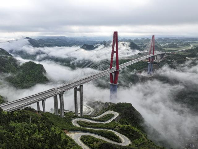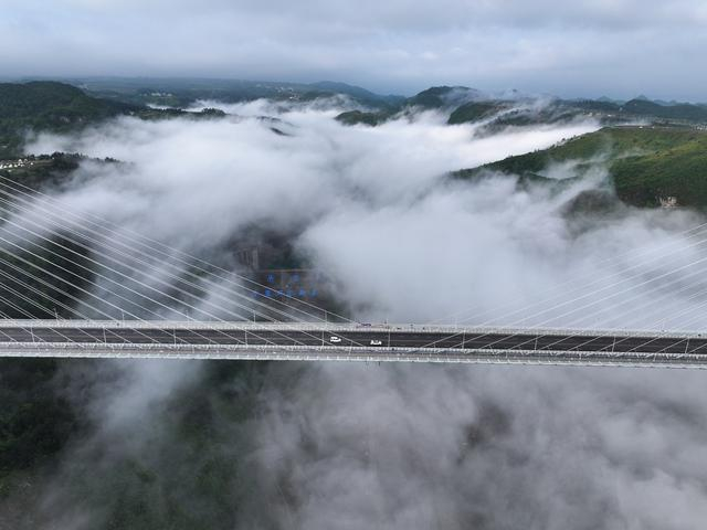 当日,一场春雨过后,贵州省龙里县的龙里河大桥周边出现云海景观,晨曦中的大桥仿佛飞架于云端之上,蔚为壮观。龙里河大桥全长1260米,主桥及塔柱设计有观光旅游玻璃栈道、全景观光电梯等旅游设施,是贵州探索“桥旅融合”打造的新“网红”景点。