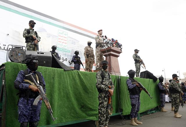5月2日,也门胡塞武装发言人叶海亚·萨雷亚(上右二)在首都萨那发表讲话。新华社发(穆罕默德·穆罕默德摄)新一轮巴以冲突爆发以来,胡塞武装频繁使用导弹和无人机在红海、阿拉伯海等海域袭击“关联以色列”的船只,并不时对以陆上目标发动袭击。胡塞武装要求以色列停止在加沙地带的军事行动。