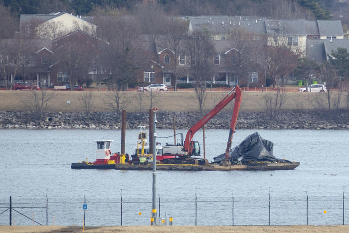 2月3日,工作人员操作工程机械在美国华盛顿里根国家机场旁的波托马克河上进行打捞作业。新华社记者胡友松摄今年1月29日,一架客机在首都华盛顿里根国家机场降落过程中与一架军用直升机相撞后坠河,造成两架飞机上67人全部遇难。调查显示,事发时,机场空管员配置不足。