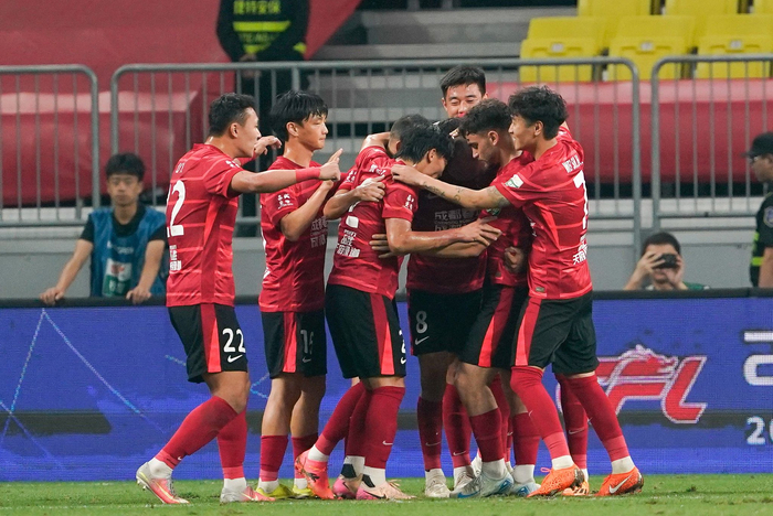 5月17日,成都蓉城队球员在比赛中庆祝进球。