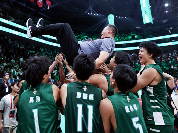 5月25日,广东实验中学队球员赛后抛起助理教练陈端(上)庆祝。
