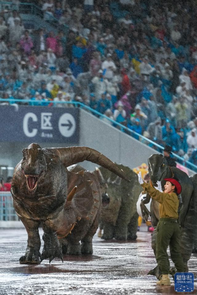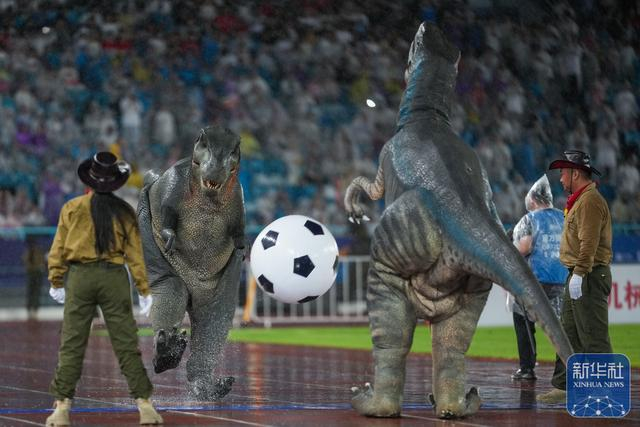 ↑ 这是6月21日拍摄的比赛中场休息时的恐龙主题表演。