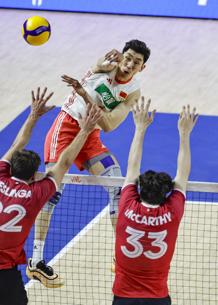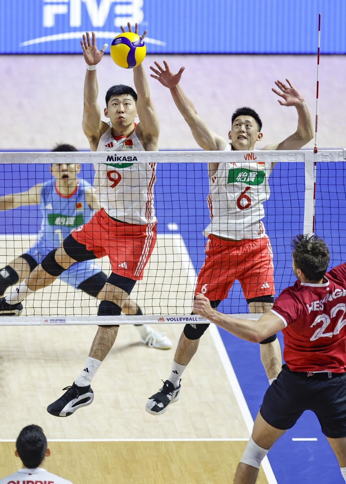 6月29日,中国队球员李咏臻(左上)与俞元泰(右二)在比赛中拦网。新华社发(乔尔·莱纳摄)第三局中国队开局便以1:6落后,虽然一度将比分追至7:8,但随后再次陷入被动,加拿大凭借稳定的一传和强攻以25:23锁定胜局。