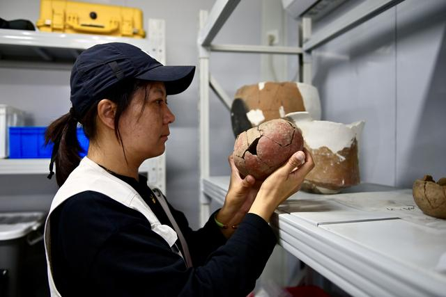 9月28日,于怀石在位于辽宁朝阳的牛河梁工作站内查看一件修复的陶罐。新华社记者 吴青昊 摄