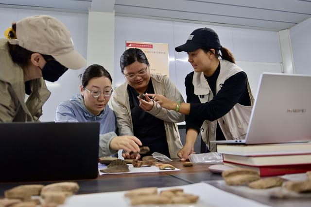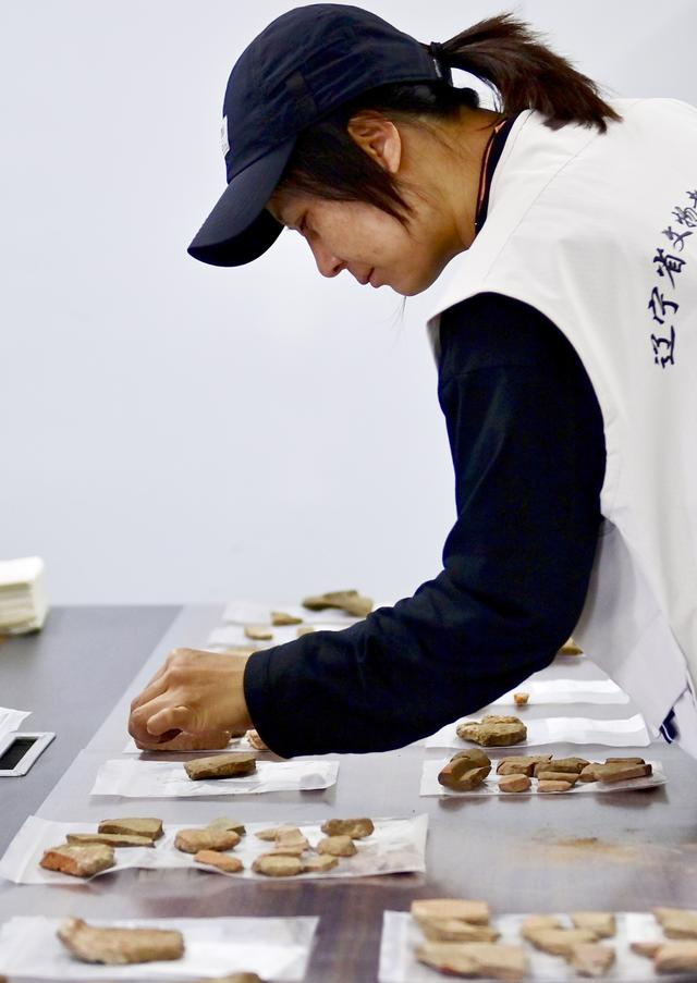 10月23日,工作人员在位于辽宁朝阳的牛河梁工作站分拣陶片。新华社记者 李钢 摄