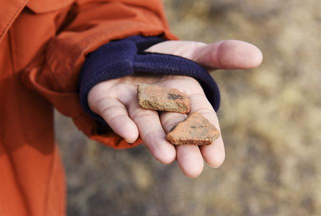 3月11日,在辽宁省朝阳市双塔区,于怀石展示在调查现场发现的碎陶片。新华社记者 吴青昊 摄