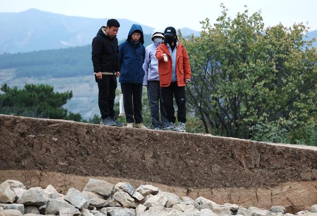 10月24日,于怀石(右一)和同事在位于辽宁朝阳的牛河梁遗址第十三地点工作。新华社记者 李钢 摄