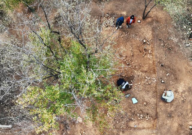 10月24日,于怀石(上右)和同事在位于辽宁朝阳的牛河梁遗址第十三地点工作(无人机照片)。新华社记者 李钢 摄