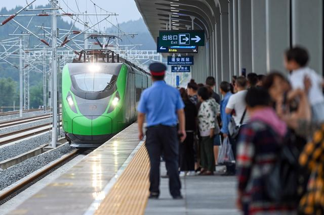 2024年6月27日,连接川陕革命老区腹地巴中、南充的巴南高速铁路正式开通运营。这是动车组列车驶入巴南高铁蓬安西站。新华社发(刘永红摄)