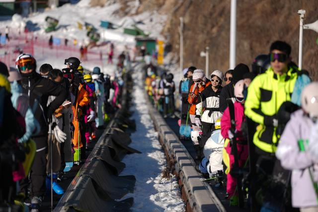 游客在湖州安吉云上草原滑雪场有序乘坐魔毯(12月28日摄)。新华社记者 黄宗治 摄
