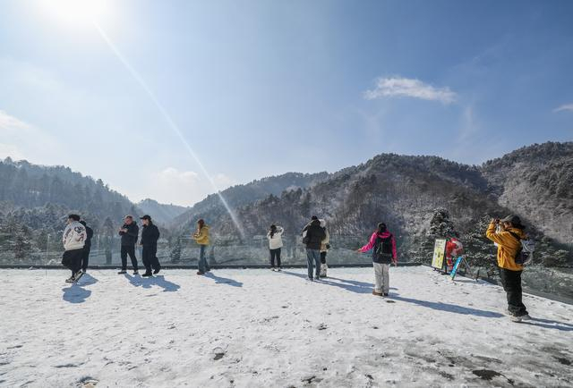 12月25日,游客们在杭州临安大明山万松岭滑雪场欣赏雪景。新华社记者 徐昱 摄