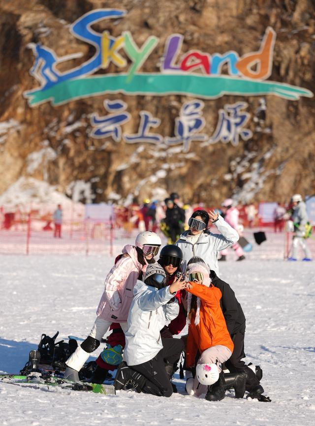 游客在湖州安吉云上草原滑雪场滑雪间隙合影(12月28日摄)。新华社记者 黄宗治 摄