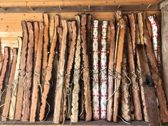 这是12月25日在斯兰别克·沙和什的家庭工坊中拍摄的手工毛皮滑雪板。新华社记者 王立明 摄走进新疆维吾尔自治区非物质文化遗产古老毛皮滑雪板制作技艺传承人斯兰别克·沙和什的家庭工坊中,慕名而来的年轻人体验刨木、钉皮等传统制作工艺,古朴的毛皮滑雪板也成了游客踊跃抢购的“网红”手作。斯兰别克·沙和什的儿子胡安什别克·斯兰别克说:“这个雪季以来,常有游客来工坊选购毛皮滑雪板周边文创产品或下定制订单,平均每天能有500多元的收入。”