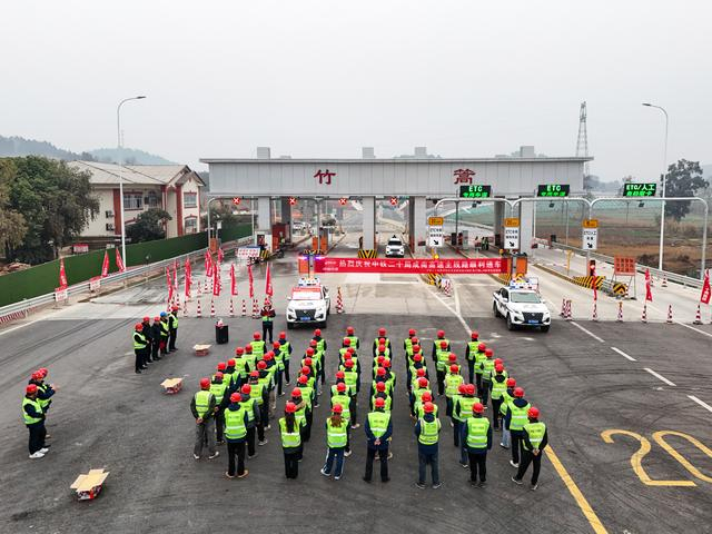 12月30日,在成南高速扩容工程竹篙收费站,中铁二十局的建设者举行仪式庆祝即将通车(无人机照片)。新华社记者 王曦 摄