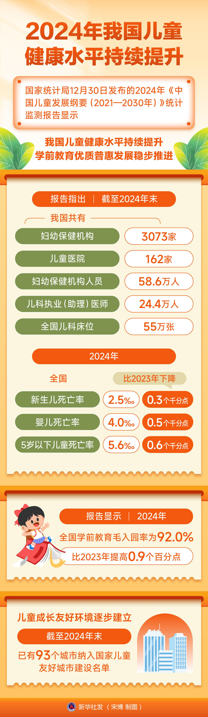 国家统计局12月30日发布的2024年《中国儿童发展纲要(2021—2030年)》统计监测报告显示,我国儿童健康水平持续提升,学前教育优质普惠发展稳步推进。