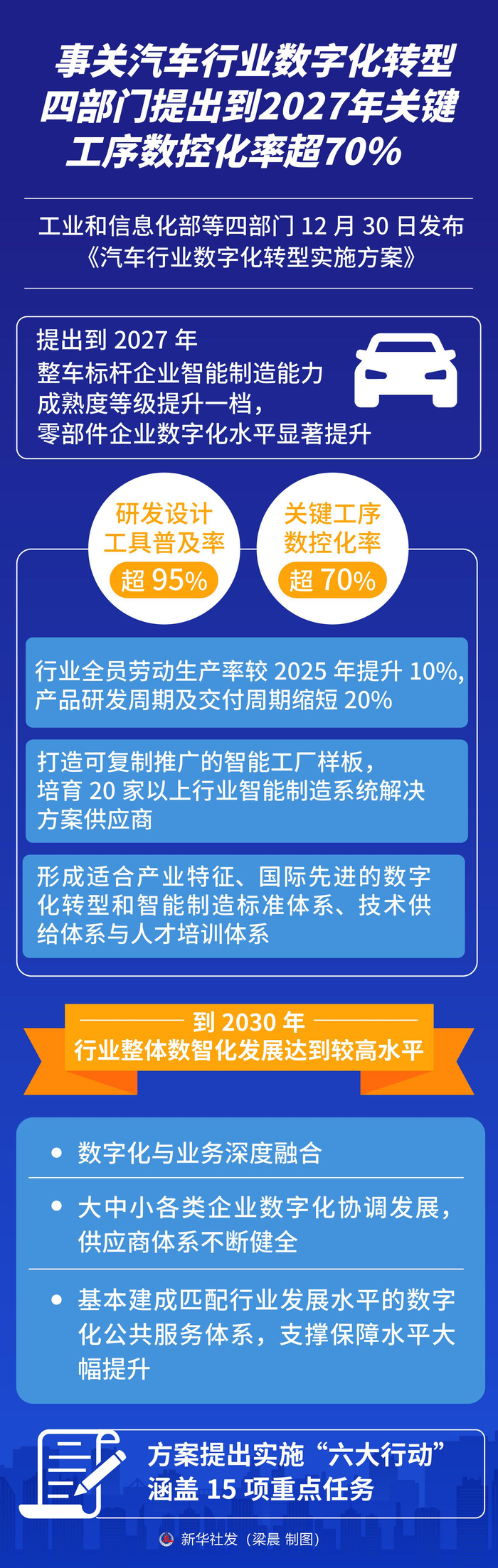 工业和信息化部等四部门12月30日发布《汽车行业数字化转型实施方案》,提出到2027年,整车标杆企业智能制造能力成熟度等级提升一档,零部件企业数字化水平显著提升;到2030年,行业整体数智化发展达到较高水平。