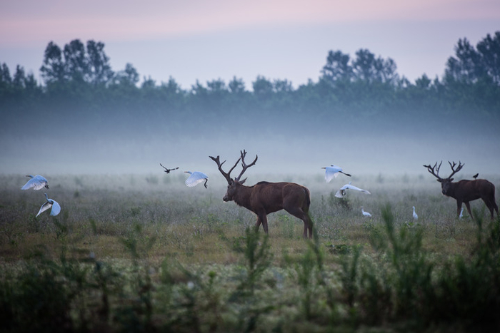 “呦呦——呦呦——呦呦——”伴随一阵清脆的叫声,一只麋鹿昂首而出,角尖挑着的晨露,在晨光下闪闪发亮。紧随其后,一群麋鹿从林间缓步走出,继而奔腾如潮。