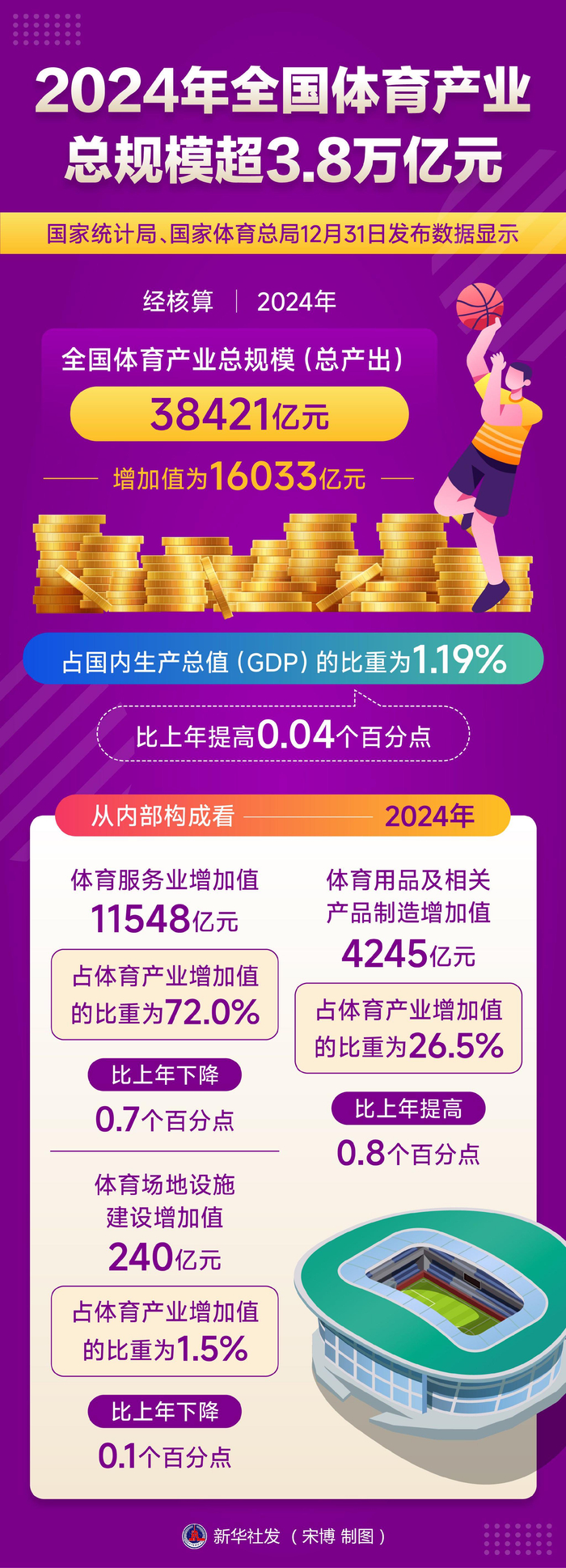 国家统计局、国家体育总局12月31日发布数据显示,经核算,2024年全国体育产业总规模(总产出)为38421亿元,增加值为16033亿元,占国内生产总值(GDP)的比重为1.19%,比上年提高0.04个百分点。
