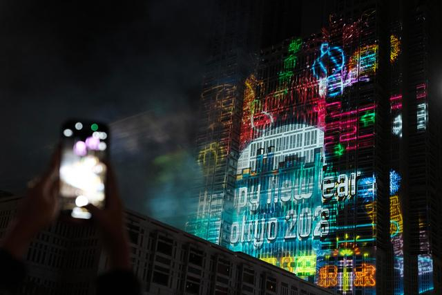 这是2026年1月1日凌晨在日本东京都民广场外拍摄的倒计时迎新年活动灯光秀。新华社记者 贾浩成 摄