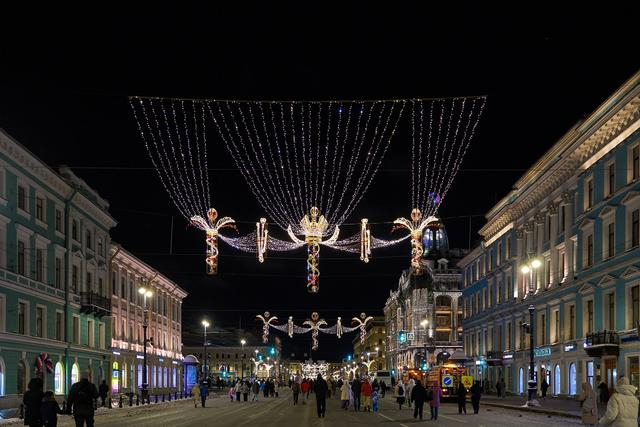 2025年12月31日,俄罗斯圣彼得堡的涅瓦大街点亮灯饰,庆祝新年的到来。新华社发(郭飞洲摄)