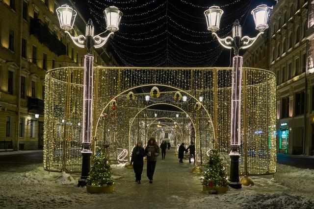 2025年12月31日,行人从俄罗斯圣彼得堡街头的灯光隧道走过。新华社发(郭飞洲摄)