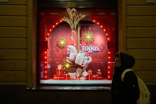 2025年12月31日,行人走过俄罗斯圣彼得堡街头用骏马装饰的橱窗。新华社发(郭飞洲摄)
