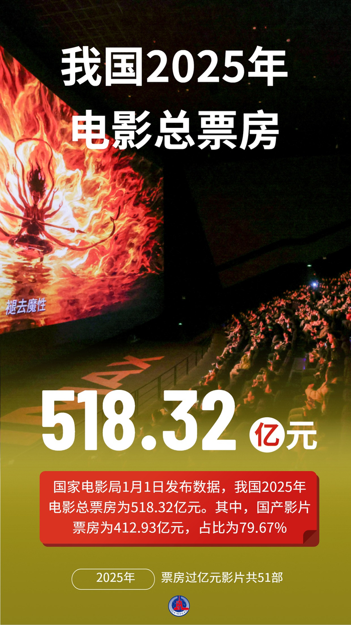 国家电影局2026年1月1日发布数据,我国2025年电影总票房为518.32亿元。其中,国产影片票房为412.93亿元,占比为79.67%。