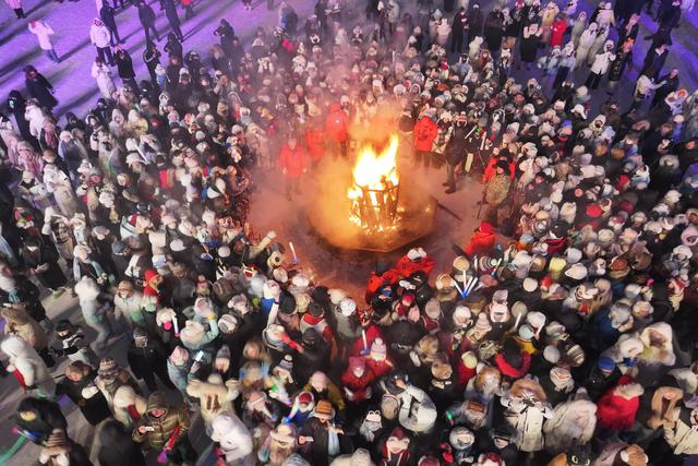 2025年12月31日晚,人们在黑龙江省漠河市北极村围着篝火迎接新年(无人机照片)。新华社发(邵天李摄)