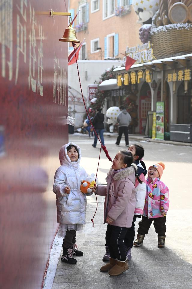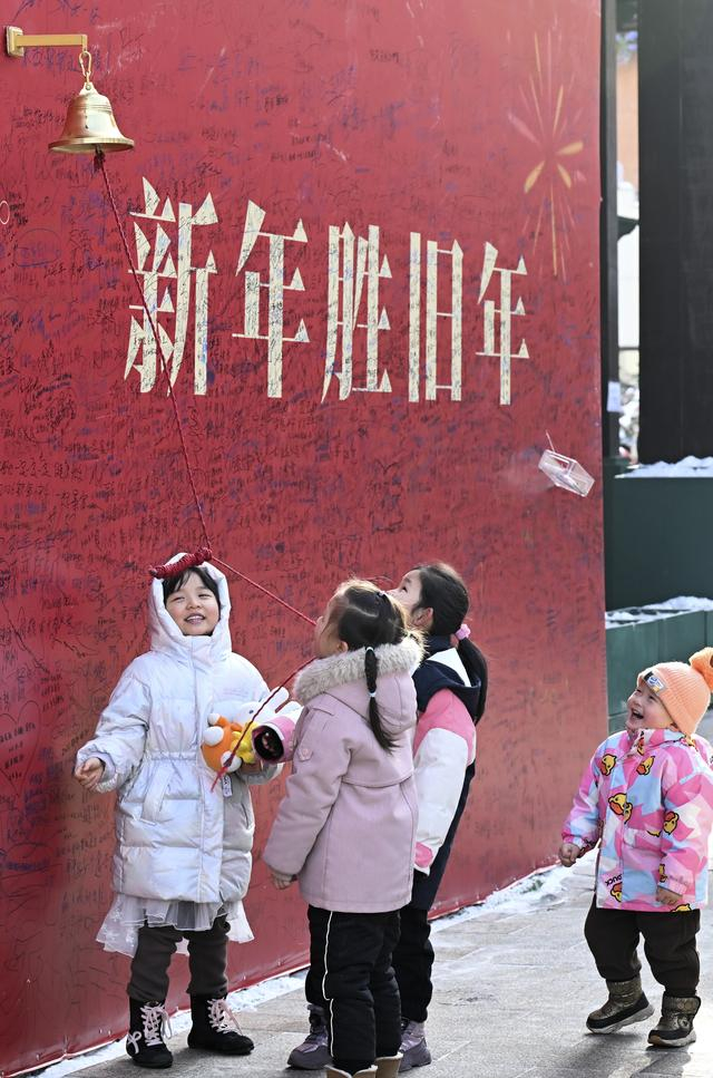 2026年1月1日,在乌鲁木齐大巴扎步行街疆来城,小朋友拉动绳索敲响新年钟声。新华社发(徐锐 摄)
