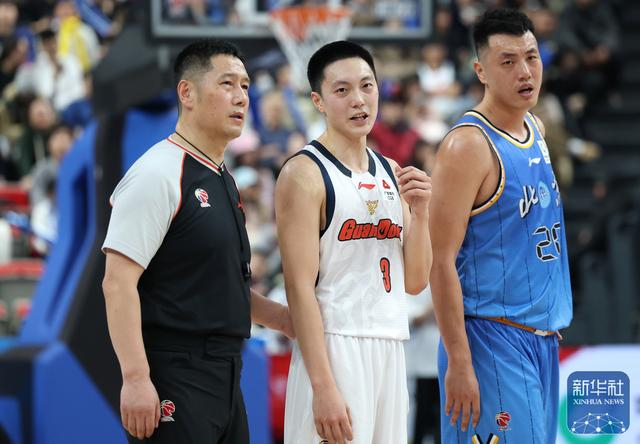 ↑ 北京北汽队球员翟晓川(右)与广东东阳光队球员胡明轩(中)在比赛中与裁判交流。