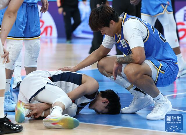 ↑ 北京北汽队球员赵睿(右)安慰在比赛中受伤的广东东阳光队球员徐杰。