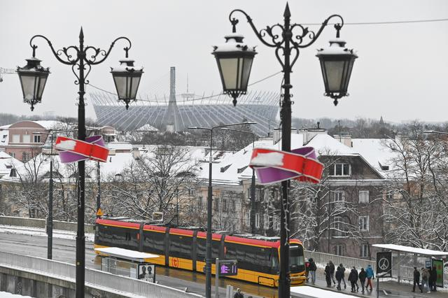 ↑1月1日,在波兰华沙,人们走在雪后的老城街道。