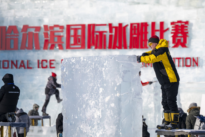 1月2日,参赛选手在哈尔滨冰雪大世界园区内进行冰雕创作。新华社记者 张涛 摄本届国际雪雕比赛将于1月6日至9日在太阳岛雪博会举办,将汇聚中国、波兰、比利时、韩国等13个国家的25支代表队。该赛事规模创下新高,百余名艺术家将在4天时间内,以雪为原料进行大型立体艺术创作。(记者杨思琪)