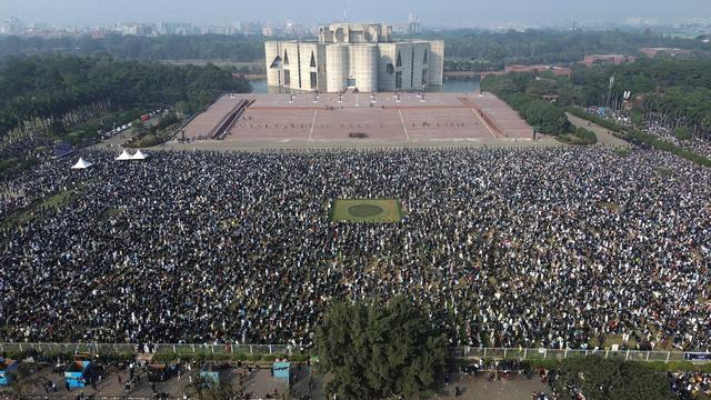 2025年12月31日,人们在孟加拉国首都达卡的国会大厦附近参加卡莉达·齐亚的葬礼(无人机照片)。