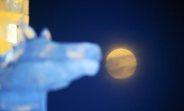 1月3日在黑龙江省哈尔滨市冰雪大世界园区拍摄的月亮。新华社发(张树摄)