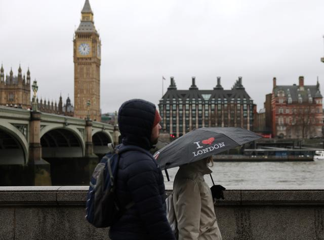 1月27日,人们撑伞行走在英国伦敦大本钟附近。新华社记者李颖摄