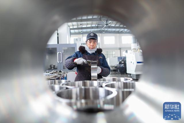 ↑1月29日,工人在位于江苏省兴化市戴南镇的江苏唐刘兴东不锈钢有限公司生产车间检测产品。新华社发(周社根摄)