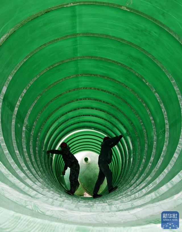 ↑1月28日,在位于江苏省海安市南莫镇的江苏五水环境工程有限公司,工人赶制玻璃钢污水处理设备。新华社发(周强摄)