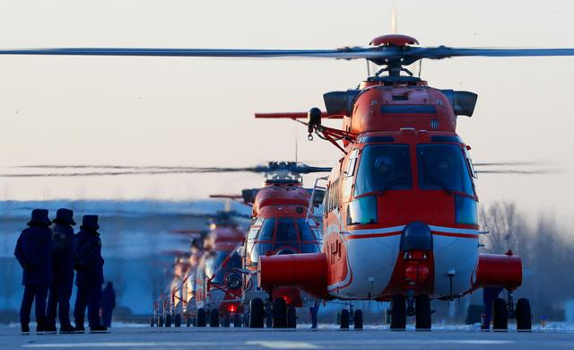 1月29日,在空投实战化训练现场,救援直升机增速飞向空投预定地点。新华社发(闫安童摄)